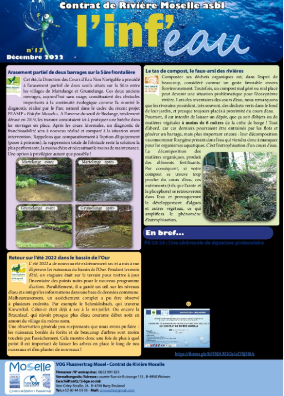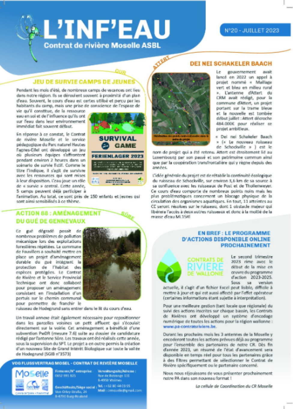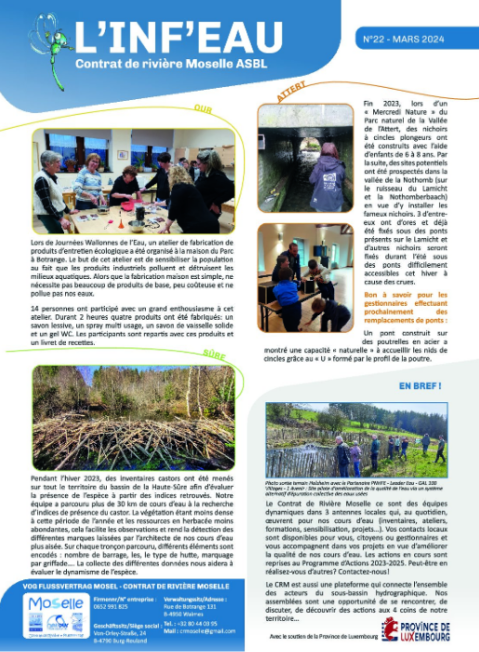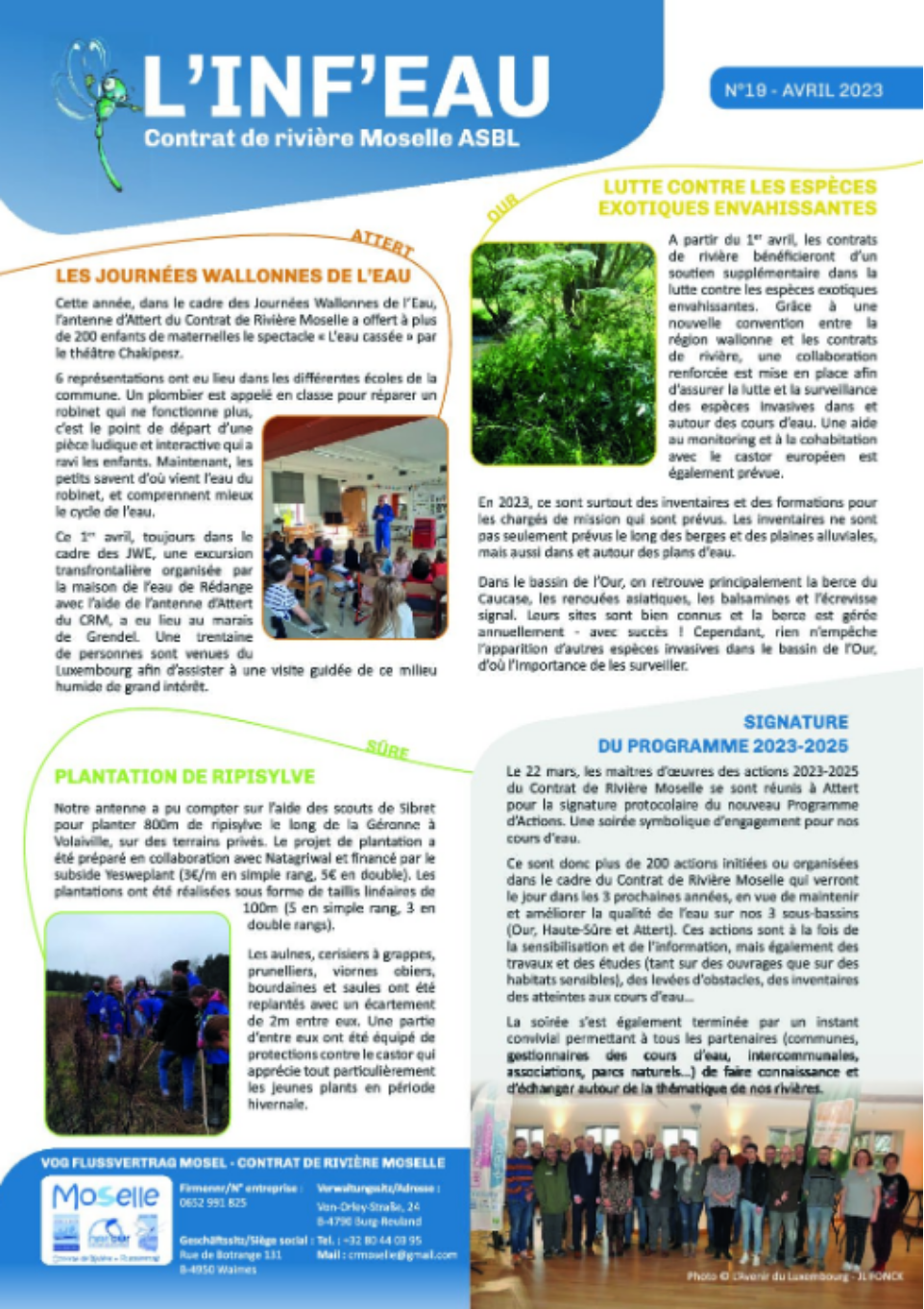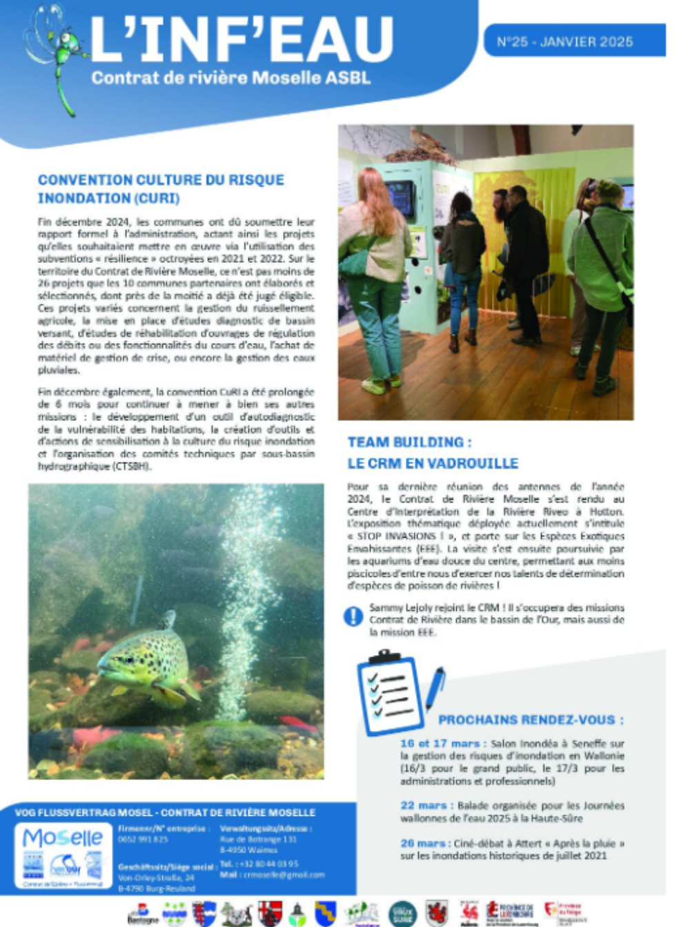 L’Inf’Eauest une newsletter qui met en lumière l’ensemble des actions, projets et actualités du Contrat de Rivière Moselle. À travers chaque numéro, nous partageons les initiatives menées sur le terrain, les événements marquants ainsi que les avancées dans nos missions.