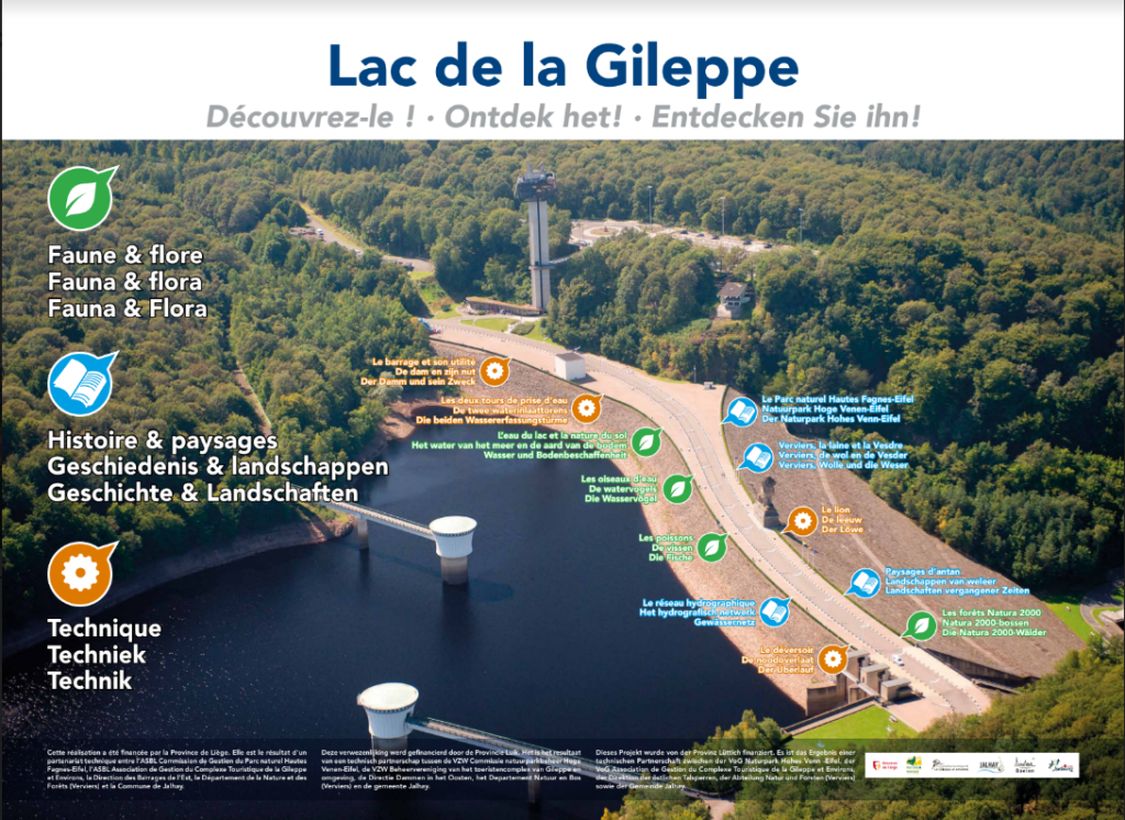 Natuurliefhebbers kunnen genieten van informatieborden over de vogels en vissen in het meer, de Natura 2000-bossen, evenals water en bodem.  Technische liefhebbers zullen geboeid zijn door de twee waterinlaattorens, de beroemde leeuw, de overlaat…  En uiteraard door het huidige en vroegere gebruik van de stuwdam.