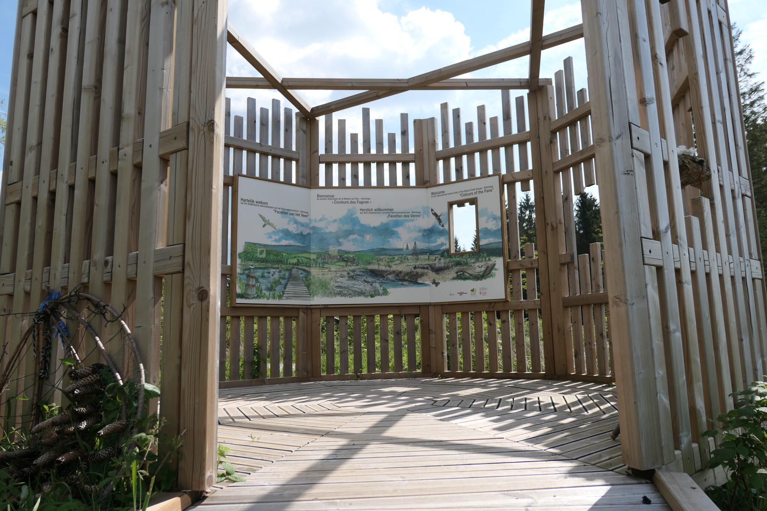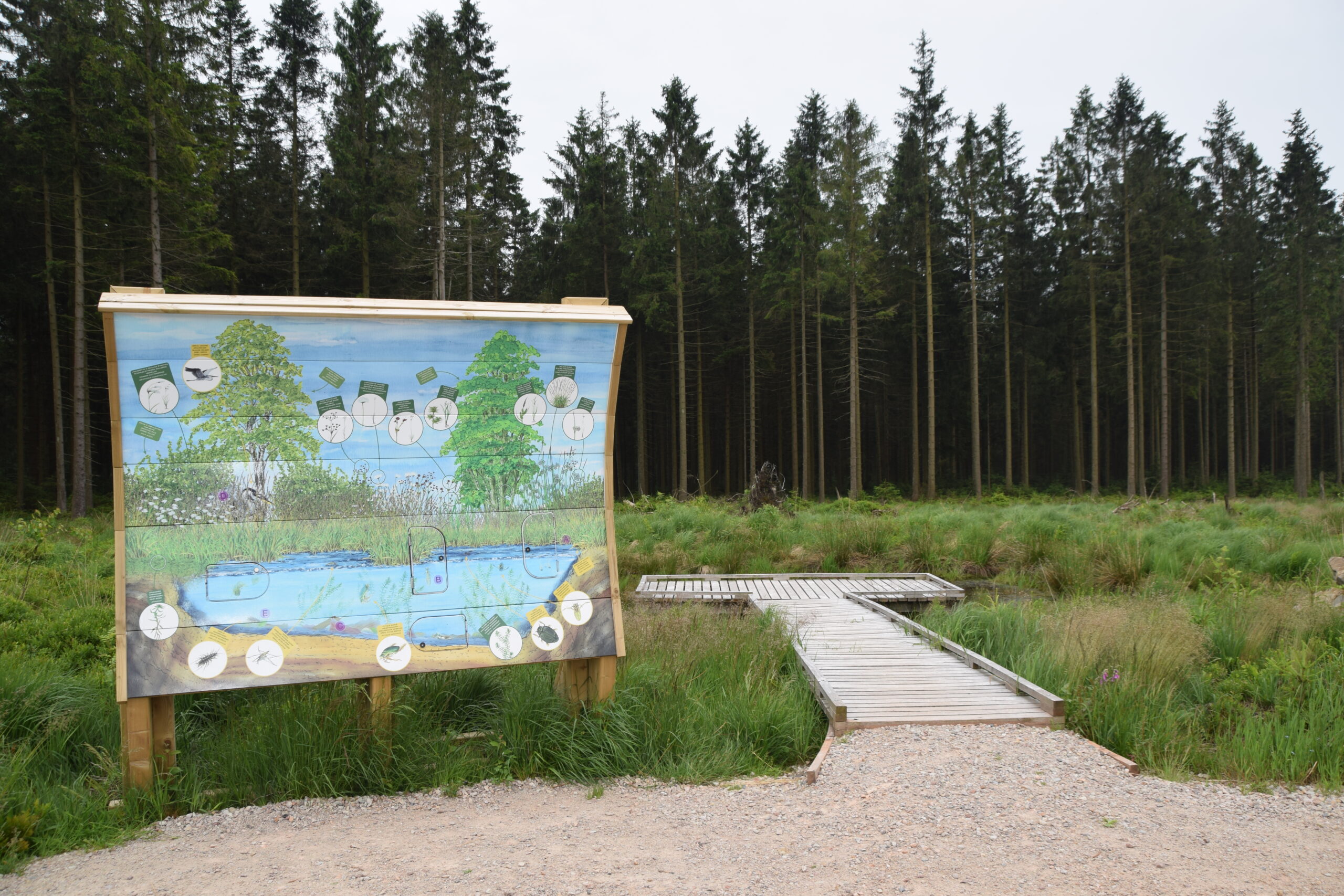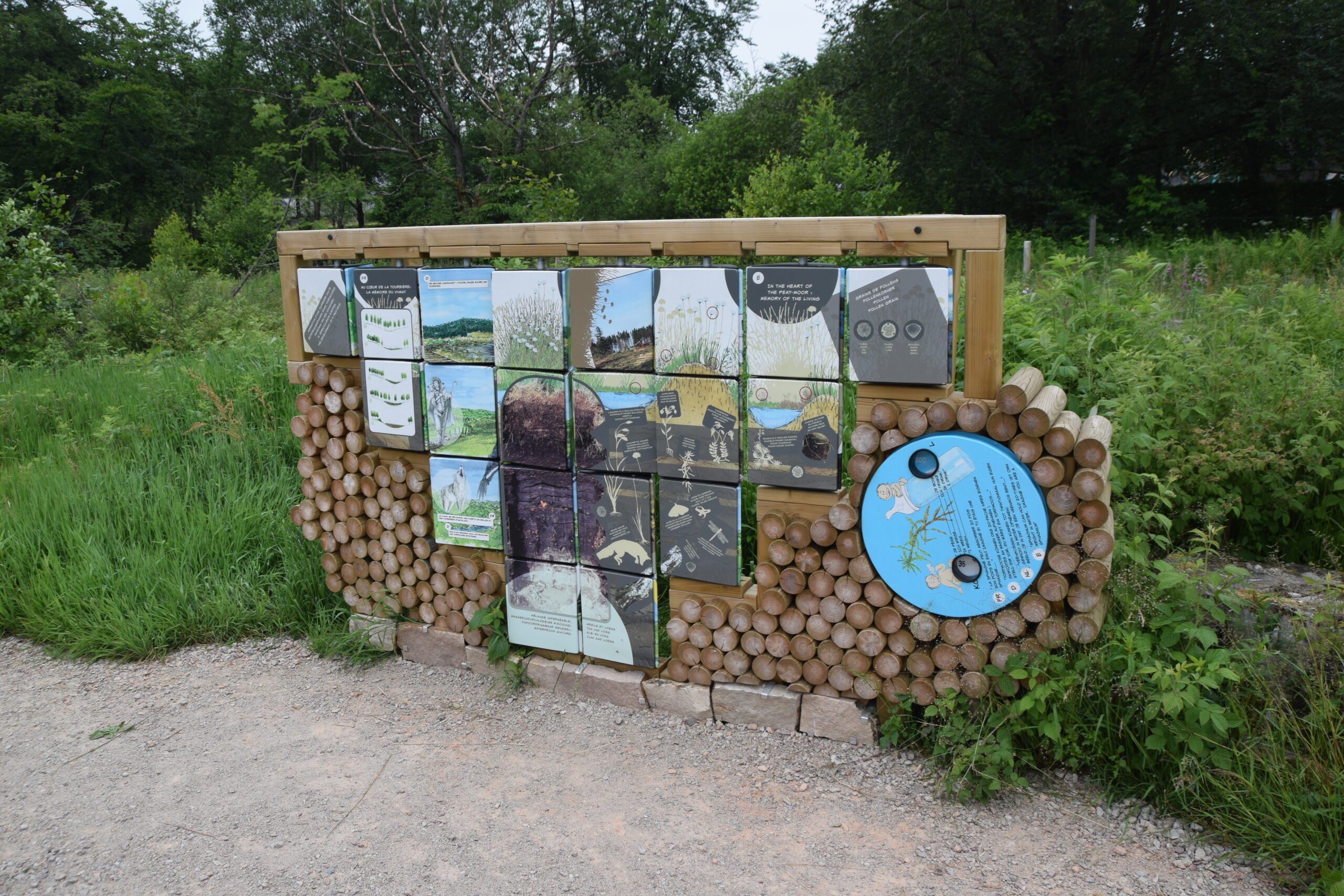Ontdek ons educatief buitenparcours van 800 m met tien geïllustreerde en interactieve modules over verschillende thema’s: venen, geodesie, bomen, geologie, vijvers, het weer en waterzuivering, enz.