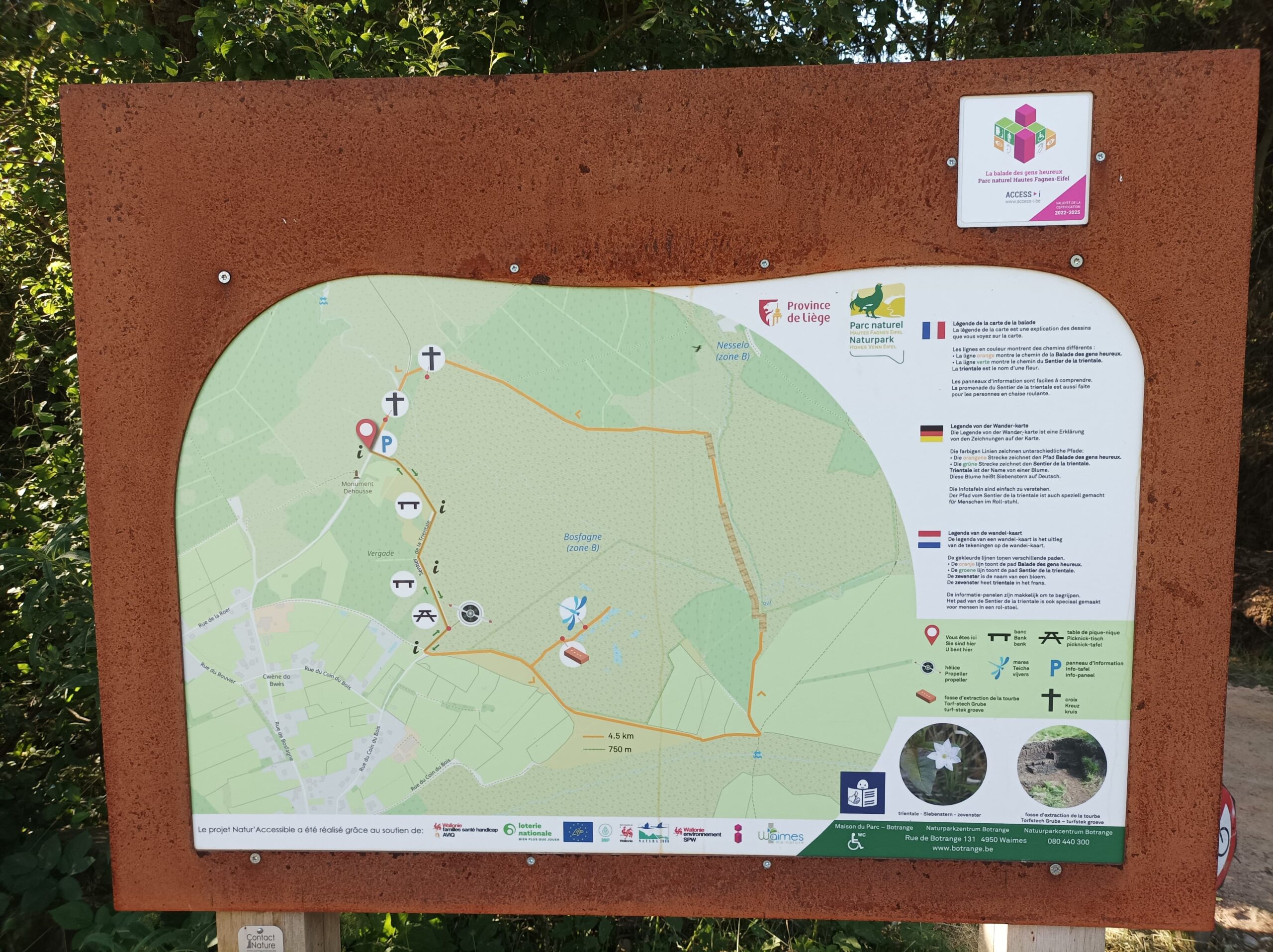 Het Natuurpark Hoge Venen-Eifel heeft de wandeling “La balade des gens heureux” in Sourbrodt aangepast en hernoemd tot “Trientalenpad”. De toegankelijkheid voor personen met beperkte mobiliteit werd verbeterd met een aangepaste ondergrond, en er werden vijf didactische modules geplaatst in eenvoudig te lezen en te begrijpen taal (Frans, Duits en Nederlands). Daarnaast zijn er twee parkeerplaatsen voor personen met beperkte mobiliteit toegevoegd aan de bestaande parkeermogelijkheden.
